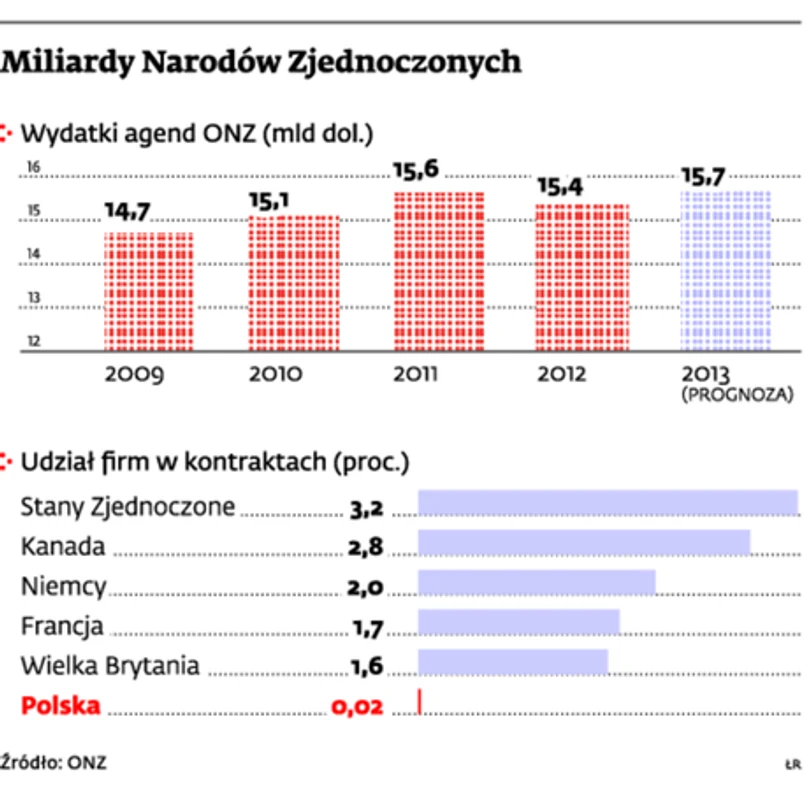 Organizacja Narodów Zjednoczonych (ONZ) to największa na świecie międzynarodowa organizacja, która aby wypełniać swoje statutowe zadania, dysponuje pokaźnym budżetem. W 2012 r. łączna wartość zakupów w ramach zamówień publicznych wszystkich agend ONZ wyniosła 15,4 mld dol. Polskie firmy miały w tym udział symboliczny. Niemieckie natomiast podpisują co roku kontrakty wartości sto razy większej.