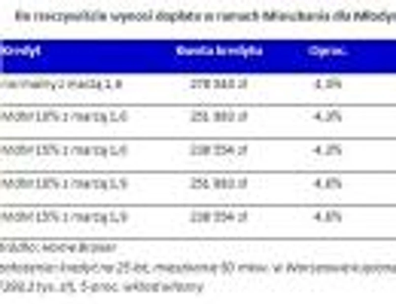 Jeśli kupujący nie ma dzieci i chciałby skorzystać z programu Mieszkanie dla Młodych, może liczyć na 10-proc. dopłatę w kwocie 26 658 zł (wskaźnik dla Warszawy wynosi 5331,50 zł), co oznacza, że kwota zaciąganego kredytu wyniesie 251,9 tys. zł). Jeśli bank da mu kredyt na tych samych warunkach co standardowemu klientowi (z marżą 1,6 p.p.), wówczas rata spadnie do 1372 zł (o 9,6 proc.), ale w przypadku gdy bank podniesie swój zarobek o 0,3 p.p., rata wyniesie 1414, a realna obniżka w stosunku do zakupu mieszkania bez wsparcia MdM to 6,8 proc. Dla uproszczenia w obliczeniach pominęliśmy prowizję za udzielenie kredytu i obowiązkowe ubezpieczenia.