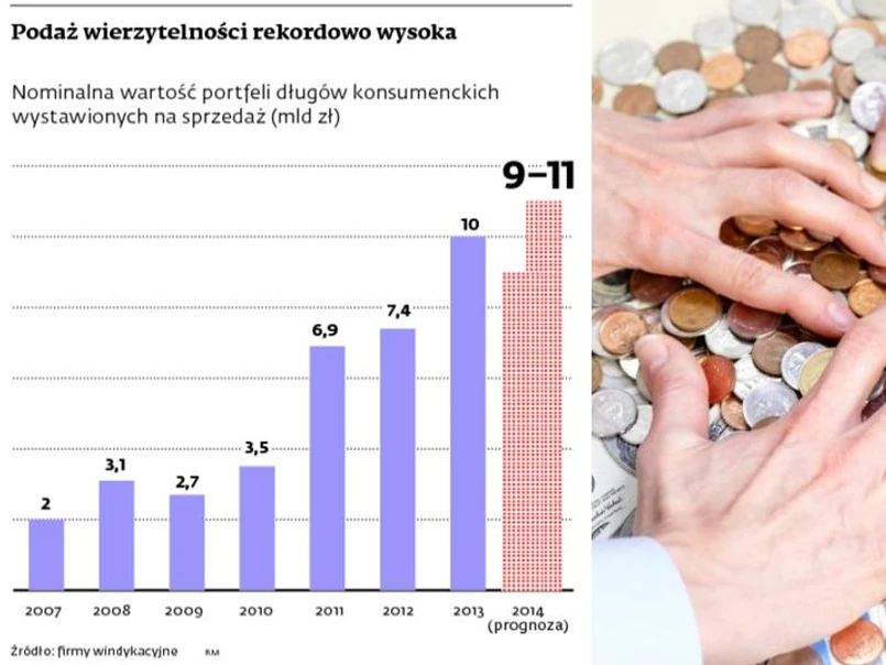 Zdaniem Anny Gawęskiej w tym roku podaż długów może być nieco niższa od ubiegłorocznej, wyniesie ok. 9 mld zł. Ale to jedna z bardziej pesymistycznych prognoz na rynku. Krzysztof Matela zakłada, że łączna wartość spraw (czyli wierzytelności wystawionych na sprzedaż i przekazanych do egzekucji na zlecenie) sięgnie w tym roku 25 mld zł. Sławomir Szarek, prezes Casus Finanse, też spodziewa się bicia kolejnych rekordów w ciągu najbliższych dwóch– –trzech lat.