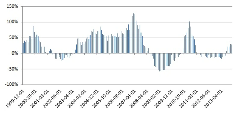Znacząca poprawa zachodzi począwszy od okresów siedmioletnich, gdzie odsetek tych zakończonych na minusie spadł do 10 proc. Średni zysk z siedmioletniej inwestycji podliczyliśmy na 105,3 proc. (min. -17,1 proc., maks. 253,8 proc.), co oznacza 12,7 proc. średnio w skali roku. Na tym kończą się straty, bo spośród analizowanych okresów ośmioletnich i dłuższych wszystkie zakończyły się na plusie. W przypadku ośmioletnich średni zysk wyniósł 132,4 proc. (min. 14,2 proc., maks. 351,7 proc.), czyli średnio rocznie 10,4 proc.