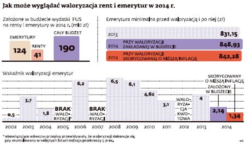 Przygotowując budżet na 2014 r., rząd założył, że inflacja na koniec 2013 r. wyniesie 1,9 proc., a płace wzrosną o 1,2 proc. Dlatego szacowano, że emerytury i renty wzrosną w 2014 r. o 2,14 proc. Ale już wiadomo, że inflacja wyniosła 1,1 proc. Gdyby więc realny wzrost płac utrzymał się na zakładanym poziomie, to waloryzacja byłaby niższa i wyniosłaby 1,34 proc. Byłaby wówczas niższa od zakładanej o 0,8 pkt proc. Ponieważ 1 pkt proc. podwyżki świadczeń odpowiada 1,66 mld zł, resort pracy szacuje nadwyżkę na wspomniane 1,3 mld.