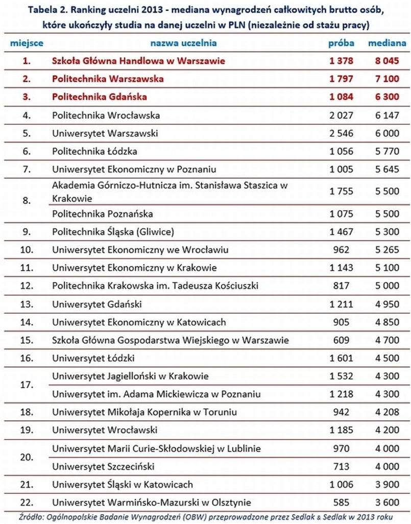 Na podium wśród absolwentów z krótkim stażem pracy znalazły się ponadto: Uniwersytet Ekonomiczny w Poznaniu (3,7 tys. zł), Politechnika Warszawska (3,5 tys. zł).