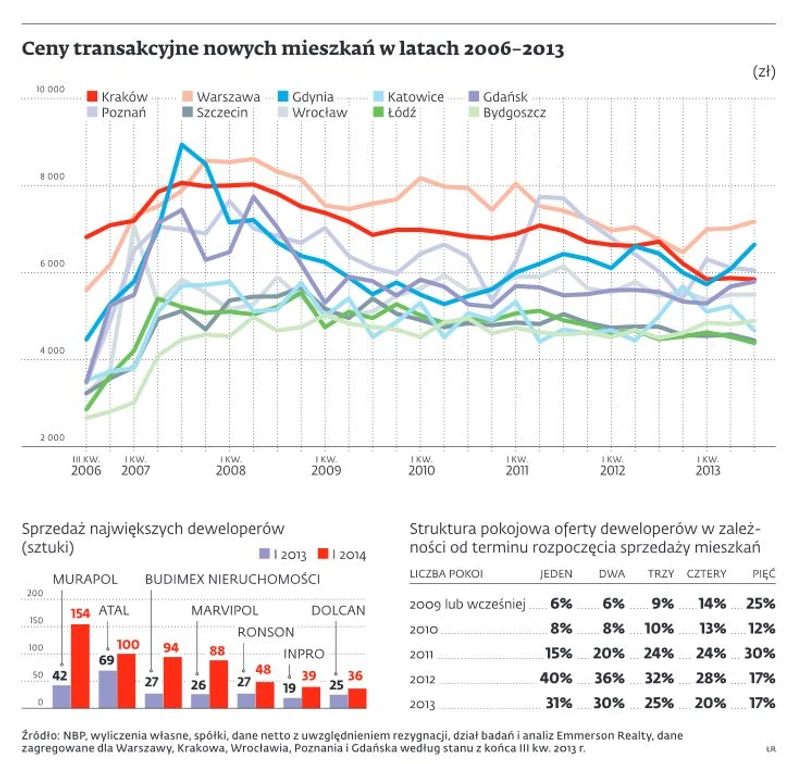 Deweloperzy z przytupem rozpoczęli 2014 r. Z informacji przekazanych DGP przez grupę największych krajowych spółek wynika, że w styczniu znalazły klientów na 559 lokali. To ponad dwa razy więcej niż przed rokiem. Już 2013 r. był dla nich rekordowy. Według firmy Reas deweloperzy działający w sześciu największych aglomeracjach (Warszawie, Krakowie, Wrocławiu, Poznaniu, Łodzi i Trójmieście) sprzedali wtedy blisko 36 tys. lokali, tyle samo co w 2007 r., w szczycie ostatniej hossy na rynku nieruchomości. O ile liczby są takie same, o tyle duże zmiany zaszły w obrazie zgłaszających się do deweloperów klientów.