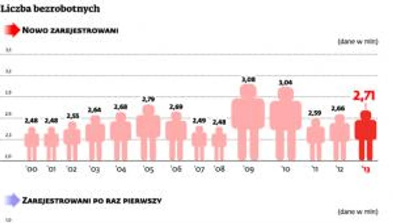 Według danych resortu pracy w 2013 r. było ponad 2,7 mln nowo zarejestrowanych osób bez zajęcia. Prawie tyle samo zostało wykreślonych, bo znalazło pracę lub nie potwierdziło gotowości do jej podjęcia. W efekcie liczba bezrobotnych była w końcu 2012 r. o 21 tys. większa niż w grudniu roku poprzedniego i wyniosła ponad 2,1 mln.