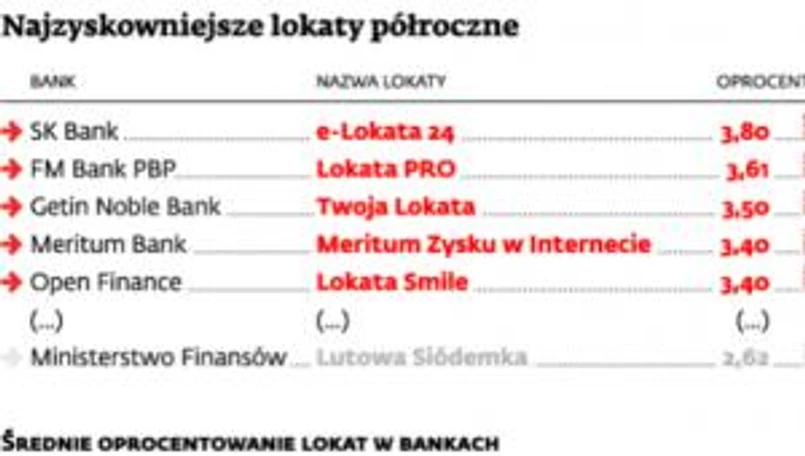 Z najnowszych danych firmy Open Finance wynika, że półroczne depozyty zakładane w lutym pozwolą zarobić przeciętnie 2,54 proc. w skali roku. Ale niektóre banki, zwłaszcza mniejsze, płacą znacznie więcej. Z rankingu lokat o wartości 5 tys. zł przygotowanego przez Comperię wynika, że najwyżej oprocentowany depozyt 6-miesięczny oferuje SK Bank – można na nim zarobić 3,8 proc. w skali roku. Niewiele niższe odsetki oferują FM Bank PBP i Meritum – odpowiednio 3,61 proc. i 3,4 proc. Z większych banków w czołówce rankingu znalazła się jedynie oferta Getin Noble Banku, z odsetkami na poziomie 3,5 proc. w skali rocznej.