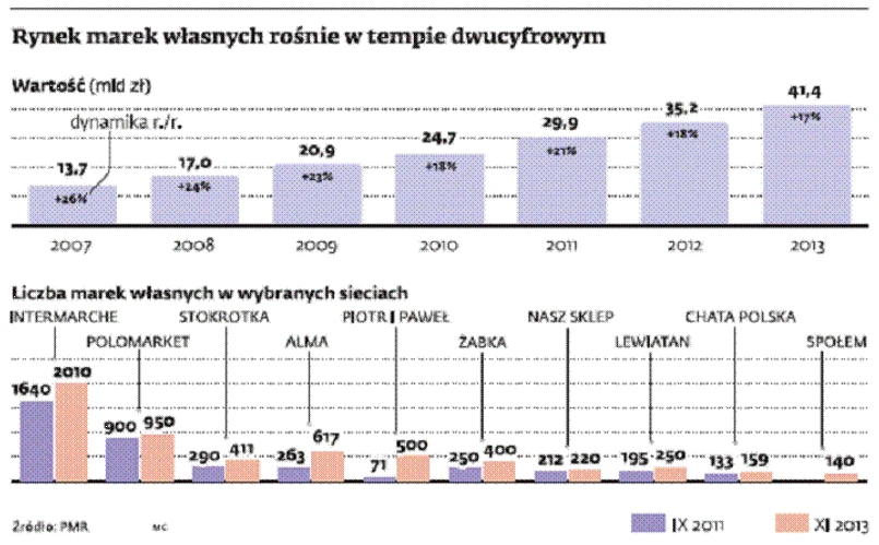 Ubiegły rok przyniósł 17-proc. wzrost sprzedaży produktów oferowanych pod markami własnymi sieci handlowych. Polacy wydali na nie 41,4 mld zł, czyli dwa razy tyle, ile w 2009 r. Dla porównania wartość całego detalicznego