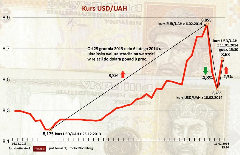 Notowania hrywny są najniższe od 5 lat. W okresie od 25 grudnia 2013 roku do 6 lutego lutego 2014 roku ukraińska waluta osłabiła się aż o 8 proc. względem dolara. Ekonomiści są zgodni, że przyczyną jest kryzys gospodarczy, ale również ostatnie protesty i chaos polityczny. W trakcie notowań 6 lutego jeden dolar przez chwilę kosztował już nawet dziewięć hrywien. Za euro trzeba było zapłacić ponad 12 hrywien. Dziś około godziny 15:30 kurs USD/UAH wynosił 8,6.