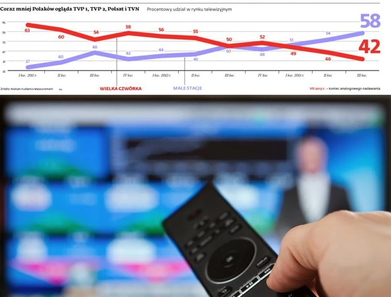 Już teraz widać, że zmiany technologiczne skutkują przetasowaniami na rynku TV. Nie tylko zakończył się dyktat wielkiej czwórki (TVP 1, TVP 2, Polsat i TVN), ale nawet razem z udziałami stacji tematycznych do nich należących jest im coraz trudniej zgarnąć duży kawałek tortu. Po zsumowaniu udziałów wszystkich kanałów TVP w styczniu tego roku okazuje się, że mają one niecałe 32 proc. rynku, TVN nieco ponad 20 proc., a Polsat jedynie 17,8 proc. – To ewidentnie efekt większej konkurencji wymuszonej przez bezpłatne kanały naziemne. Dlatego nadawcy stawiają na uruchamianie coraz to nowych stacji tematycznych – tłumaczy Jakub Bierzyński z domu mediowego OMD.