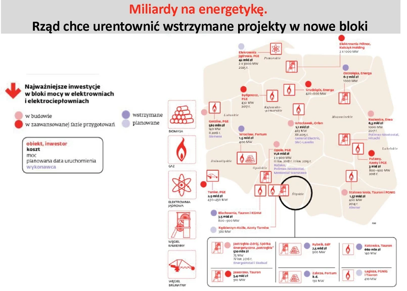 Według PMR, wartość wstrzymanych inwestycji w energetyce – np. w Ostrołęce, Rybniku, Blachowni i Wrocławiu - na ponad 31 mld zł. Z powodu straszaka importu energii, resort gospodarki głowi się nad tym, jak je urentownić. Wicepremier Janusz Piechociński zasugerował w tym tygodniu, że czas wrócić do koncepcji budowy bloku o mocy 1000 MW w Ostrołęce (dwa lata temu Energa podjęła decyzję o wstrzymaniu prac ze względu na trudną sytuację na rynku energii).