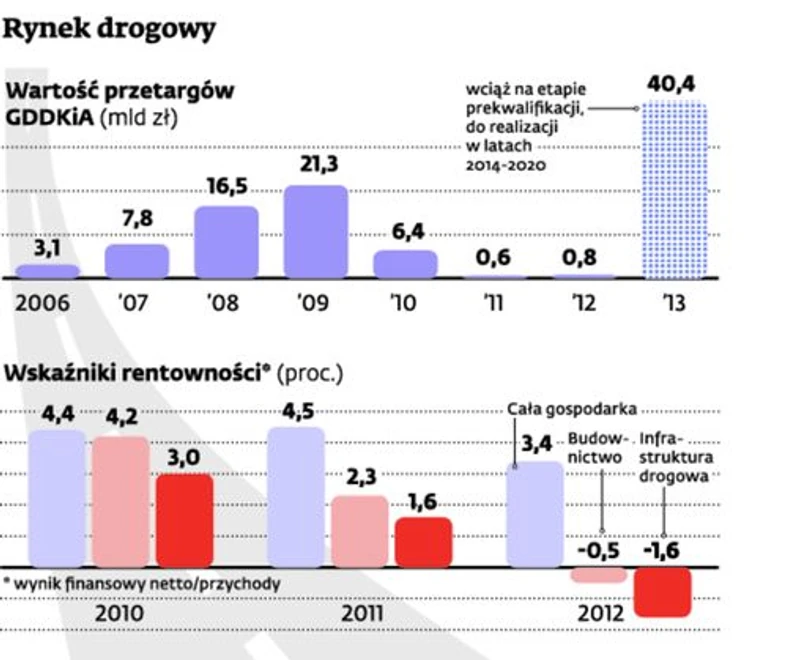 Jak wylicza EY, w latach 2010–2012 sektor budowlany generował rocznie 211 mld zł wartości dodanej brutto, czyli 13,5 proc. PKB. Ale w 2013 r. bankructwo ogłosiło 218 spółek zaangażowanych w kontrakty drogowe, a rok wcześniej – 213. Rentowność sektora spadła do -1,6 proc. w 2012 r. z 3 proc. w 2010 r.