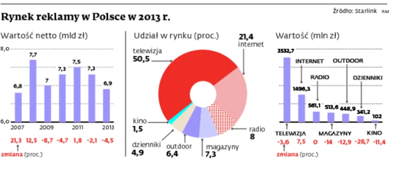 2013 r. był dla polskiego rynku reklamy drugim z rzędu zakończonym pod kreską. Jego wartość spadła w porównaniu z 2012 r. o 4,5 proc. do prawie 7 mld zł – wynika z raportu domu mediowego Starlink. Za kiepskie wyniki sprzedaży reklam odpowiadają przede wszystkim firmy telekomunikacyjne. To one zmniejszyły wydatki na reklamę najbardziej ze wszystkich branż, dając zarobić agencjom i domom mediowym o 175 mln zł, tj. o jedną piątą, mniej niż przed rokiem. Zdaniem autorów raportu jest to częściowo związane z efektem podwyższonej bazy. Chodzi o to, że w trakcie piłkarskich mistrzostw Europy w 2012 r. właściciel sieci komórkowej Orange był reklamowo wyjątkowo aktywny. Z kolei teraz operatorzy przeznaczają na reklamę mniej, m.in. ze względu na spadające przychody oraz duże inwestycje w infrastrukturę.