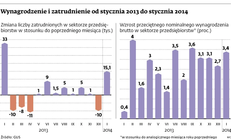 Zawiodły dane o zatrudnieniu w przedsiębiorstwach, w których liczba pracujących przekracza 9 osób. Ekonomiści spodziewali się bowiem, że będzie ono wyższe niż przed rokiem o ok. 0,6 proc. Tymczasem według GUS zatrudnienie w przedsiębiorstwach utrzymało się na takim samym poziomie jak w pierwszym miesiącu ubiegłego roku, gdy zajęcie miało w nich nieco ponad 5,5 mln osób. Było przy tym o 15,1 tys. wyższe niż w grudniu. W pewnym stopniu jest to jednak efekt czysto statystyczny. Bo w styczniu GUS uzupełnia bazę danych o przedsiębiorstwa, które zwiększyły liczbę pracowników do tego stopnia, że mają ich co najmniej dziesięciu. Równocześnie wykreślane są te firmy, które zmniejszyły zatrudnienie poniżej wymaganego minimum. Nie wiadomo więc dokładnie, ile etatów przybyło w styczniu w przedsiębiorstwach. Eksperci oczekują jednak, że zatrudnienie będzie powoli rosło. – W całym roku może wzrosnąć o 1 proc., czyli o ok. 50 tys. – szacuje Karolina Sędzimir, ekonomista PKO BP. To bardzo mało, w sytuacji gdy bezrobocie przekracza 2,1 mln.