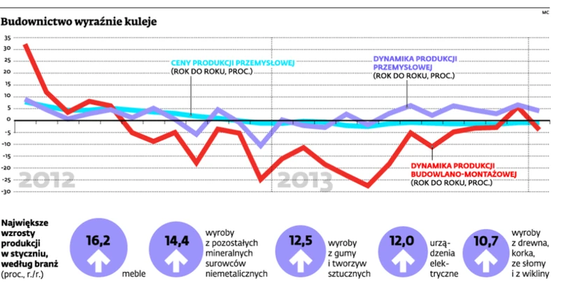 Spokój w ocenie danych o produkcji budowlanej zaleca Grzegorz Ogonek z ING Banku Śląskiego. Jego zdaniem styczniowe odczyty produkcji budowlanej zwykle są bardzo zmienne i bardzo trudno ją prognozować. – Nie przejmowałbym się tym spadkiem, takie wahnięcia od dodatniej dynamiki do ujemnej zdarzały się wcześniej dość często. W budowlance raczej nic złego się nie dzieje – mówi. I dodaje, że dane z przemysłu go nie zaskoczyły. Jego zdaniem można się było spodziewać dobrego odczytu po wcześniej publikowanych informacjach o koniunkturze.