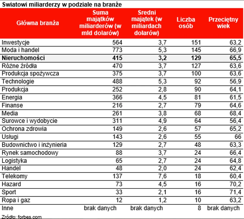 Na trzecim miejscu pod względem liczebności miliarderów uplasowała się branża nieruchomości. Zbudowała ona majątki 129 miliarderów na całym świecie. To prawie 13-krotnie lepszy wynik niż zanotowany przez branżę związaną z ropą i gazem, która według danych Forbesa zbudowała majątki tylko 10 światowych krezusów. Co ciekawe, jest to niewielki wynik nawet na tle osób związanych ze sportem lub hazardem – z tych branży pochodzi po 16 światowych miliarderów.