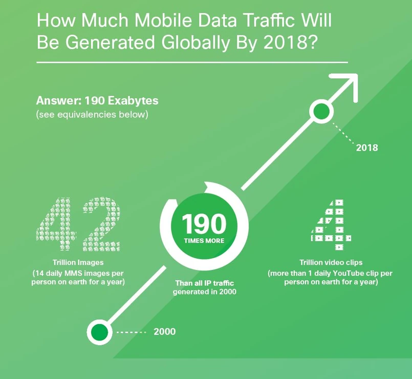 - Średnia szybkość transmisji danych wzrośnie dwukrotnie: z 1 Mb/s w roku 2013 do 2 Mb/s w roku 2018.