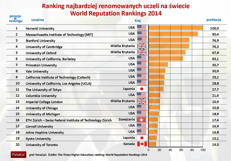 W pierwszej dziesiątce rankingu uczelni widać wyraźną dominację szkół anglosaskich, a konkretnie placówek z USA i z Wielkiej Brytanii.