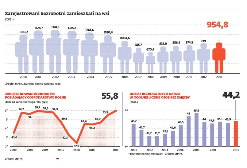 Nie dość, że gospodarstwa są małe, to jeszcze pracy jest w nich coraz mniej, przede wszystkim z powodu mechanizacji. Oprócz tego bardzo wiele polikwidowało hodowlę zwierząt, gdyż nie mogły sprostać wymaganiom sanitarnym narzuconym przez Unię Europejską. Zajmują się więc przede wszystkim uprawą roślin, która nie jest tak czasochłonna. Rolnicy, którzy nie mają zajęcia, w większości nie mogą się zarejestrować w urzędach pracy jako osoby bezrobotne nawet wtedy jeśli pracowali dodatkowo na etacie poza rolnictwem – zgodnie z ustawą o promocji zatrudnienia i instytucjach rynku pracy bezrobotnym może być ta osoba, która nie jest właścicielem lub posiadaczem nieruchomości rolnej o powierzchni użytków rolnych przekraczających 2 ha przeliczeniowe (w 2012 r. hektar przeliczeniowy dawał roczny dochód w wysokości ponad 2431 tys. zł). W efekcie w końcu ubiegłego roku w pośredniakach zarejestrowanych było tylko 56 tys. osób posiadających gospodarstwo rolne. To zaledwie 5,9 proc. bezrobotnych zamieszkałych na wsi.