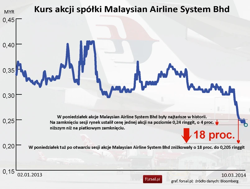 Cena akcji Malaysian Airline System Bhd. spadła o 4 proc. do 24 senów (czyli 0,24 ringgita), osiągając najniższy pułap w historii jej notowań na giełdzie. Akcje lotniczego przewoźnika były najchętniej handlowanymi na parkiecie w Kuala Lumpur, osiągając obroty na poziomie 385 milionów. Indeks FTSE Bursa Malaysia KLCI zanotował spadek w wysokości 0,6 proc., natomiast ringgit (malezyjska waluta) stracił do dolara 0,8 proc. – informuje Bloomberg.