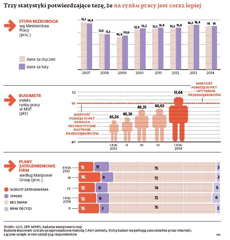 Na koniec lutego w urzędach pracy było o 3,7 tys. mniej zarejestrowanych bezrobotnych niż na koniec stycznia – wynika ze wstępnych danych resortu pracy. To niewiele, zważywszy że armia bezrobotnych nadal liczby ponad 2,2 mln osób. Jednak znacznie istotniejsze – zdaniem ministra Władysława Kosiniaka-Kamysza – jest co innego: fakt, że po raz pierwszy od 2008 r. lutowe bezrobocie było niższe niż styczniowe (choć nie w ujęciu procentowym, bo stopa nadal wynosi 14 proc.). To zaś ma dowodzić, że na rynku pracy wreszcie mamy do czynienia z długo wyczekiwanym ożywieniem. Potwierdzać tę tezę mają także badania dwóch niezależnych instytucji – Związku Przedsiębiorców i Pracodawców oraz ManpowerGroup.