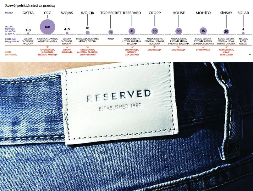 Firma LPP, właściciel marek Reserved, Cropp, House, Mohito i Sinsay, zaplanowała na ten rok natomiast otwarcie 146 sklepów za granicą, czyli o 42 więcej niż w roku ubiegłym. Spółka zamierza nie tylko otworzyć więcej placówek, ale też stawia na bardziej równomierny rozwój swoich brandów. Do tej pory inwestowała przede wszystkim w markę Reserved. Wśród marek, które planują ekspansję na obce rynki, są też Gino Rossi, Tatuum, Coccodrillo, Atlantic, Big Star, Gatta, Wojas czy Wójcik. Każda z firm otworzy od kilku do nawet kilkudziesięciu sklepów. Większość planuje przyspieszyć rozwój w porównaniu z ubiegłym rokiem. – Zaplanowaliśmy uruchomienie 10 salonów poza Polską, czyli dwa razy tyle co w 2013 r. – twierdzi Marek Szostak, dyrektor ds. marketingu Wójcik Fashion Group.