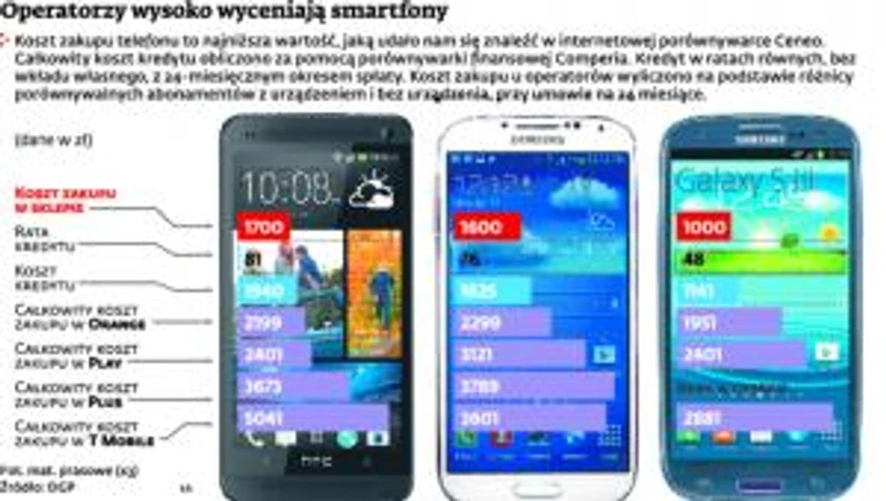 smartfonu. Policzyliśmy, ile trzeba zapłacić za smartfony u operatorów oraz gdy kupimy je na raty, zaciągając kredyt w banku. Za Samsunga Galaxy S4 w jednym ze sklepów internetowych zapłacimy 1600 zł. Korzystając z kredytu, dołożymy 225 zł, czyli wydamy łącznie 1825 zł. U operatorów koszt takiego telefonu to 2299–3800 zł. Przy najdroższym z tej grupy modelu HTC One za smartfon u operatora przepłacimy od 240 zł do 3100 zł, a nie licząc kosztów