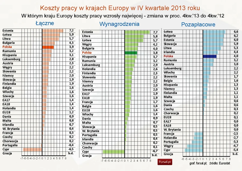 Wśród krajów Unii, dla których dostępne są dane, najmocniejszy roczny skok kosztów pracy zanotowała Estonia (7,2 proc.), Łotwa (5,9 proc.) oraz Litwa (5,7 proc.). W pierwszej piątce znalazła się także Bułgaria (4,3 proc.) i Polska (3,9 proc.). Koszty pracy spadły zaś najmocniej na Cyprze (-6,5 proc.) i w Portugalii (- 0,4 proc.).