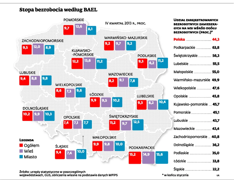 22,4 proc. – tyle wyniosła w styczniu stopa bezrobocia rejestrowanego w woj. warmińsko-mazurskim. Była to najwyższa wartość w kraju. Jeśli jednak wziąć pod uwagę nie tylko legalny rynek pracy, ale też szarą strefę, okaże się, że wskaźnik bezrobocia wynosił w tym województwie w IV kwartale ubiegłego roku zaledwie 9,2 proc. i był o 0,6 pkt proc. niższy od średniej krajowej. W rezultacie region ten jest dopiero na 13. pozycji pod względem poziomu bezrobocia liczonego na podstawie badań aktywności ekonomicznej wśród 16 województw. Faktycznie natomiast najgorsza jest sytuacja na rynku pracy w woj. podkarpackim, gdzie po uwzględnieniu szarej strefy bezrobocie wynosi aż 15,2 proc. – w tym na wsi 14,9 proc.