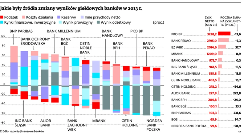 wypadku było to spowodowane z nadzwyczajnymi zyskami z 2012 r. – związanymi ze sprzedażą akcji TU Europa oraz wydzieleniem z grupy obecnie funkcjonującego samodzielnie Getin Noble Banku. Spadek wyniku o jedną czwartą, w porównaniu z 2012 r., odnotował Bank BPH, gdzie od kilku lat trwa ograniczanie skali działania. W mniejszym stopniu zmniejszyły się zyski dwóch największych krajowych banków – PKO BP i Pekao. Szczególnym przypadkiem jest Alior Bank. Wykazał on 228 mln zł zysku netto – ponad trzy razy więcej niż w 2012 r. Tyle że rok wcześniej podawał, iż jego zysk netto za 2012 r. wyniósł 174 mln zł, a bez uwzględnienia jednorazowych kosztów związanych z debiutem giełdowym było to nawet 332 mln zł. Znacząca rewizja wyniku to efekt podporządkowania się zaleceniom Komisji Nadzoru Finansowego co do sposobu księgowania