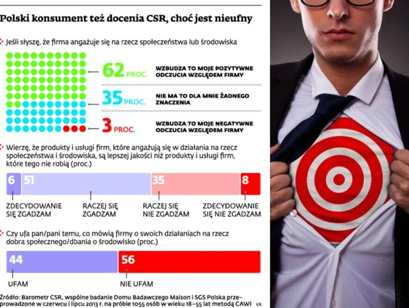 Światowy trend w zmianie świadomości konsumentów potwierdzają także badania na polskim gruncie. Jednocześnie Polacy sceptycznie podchodzą do deklaracji firm dotyczących angażowania się w działania na rzecz społeczeństwa lub środowiska. Ponad połowa z nas nieufnie przyjmuje informacje firm dotyczące takich działań. niemniej fakt angażowania się w inicjatywy na rzecz społeczeństwa lub na rzecz środowiska wzbudza pozytywne emocje wobec firmy u 62 proc. respondentów Barometru CSR. Ankietowani zapytani, jakie konkretnie są to emocje, w 3/4 wskazali większe zaufanie, chęć skorzystania z usług firmy lub zakupu jej produktów, a nawet dzielenie się z innymi pozytywnymi doświadczeniami związanymi z firmą.