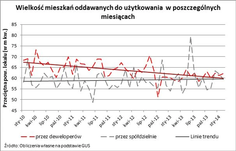 Trzeba jednak zauważyć, że dane prezentowane przez GUS charakteryzuje na tyle duża zmienność, że obserwowanie trendów i zależności jest możliwe dopiero na podstawie wskaźników uśrednionych dla dłuższego okresu. Ciekawe wnioski przynosi na przykład analiza przeprowadzona na podstawie średnich kroczących dla okresów dwunastomiesięcznych. Zastosowanie tej miary pozwala zniwelować odczyty przypadkowe i likwiduje zaburzenia wyników, które wynikają z sezonowości. Tak przetworzone dane pokazują, że od 2006 r. hossa na rynku spowodowała powiększanie mieszkań oddawanych do użytkowania. O ile na początku 2006 roku miały one niecałe 63 m kw., to już dwa lata później przeciętna powierzchnia przekraczała 68 metrów. Dopiero od 2009 r. widoczny jest spadek przeciętnych powierzchni mieszkań oddanych do użytkowania. Doprowadził on do obniżenia odczytu z poziomu 68,2 m kw. w styczniu 2009 do 59,4 m kw. we wrześniu 2013 r. Co ciekawe, od tego momentu przeciętna wielkość mieszkania oddawanego przez deweloperów do użytkowania zaczęła rosnąć. Po pięciu miesiącach wzrostów wskaźnik osiągnął wartość 61,2 m kw. Z coraz większym prawdopodobieństwem można więc mówić o zmianie trendu. Sprzyjać może temu fakt, że w roku 2012 Rada Polityki Pieniężnej rozpoczęła cykl obniżek stóp procentowych. W 2012 roku skończył się też program dopłat do tanich mieszkań – „Rodzina na swoim”. Projekty rozpoczynane w 2012 r. mogły być też przygotowywane z myślą o zbliżającym się ożywieniu na rynku. Najbliższe miesiące pokażą czy rzeczywiście tak było.