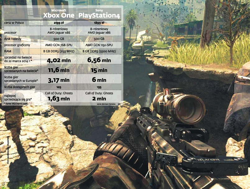 Na polskim rynku dostępnych jest kilka urządzeń domowych i przenośnych, ale główna walka toczy się między Sony i Microsoftem, producentami PlayStation i Xboxa. Na razie wszystko wskazuje na to, że wygrywa japońska firma. Xbox One, następca Xboxa 360, miał swoją premierę na świecie w listopadzie ubiegłego roku, ale do polskich sklepów oficjalnie trafi prawie rok później. Z takiej strategii Microsoftu zadowolone jest Sony, którego konsola nowej generacji PlayStation 4 jest dostępna nad Wisłą już od czterech miesięcy.