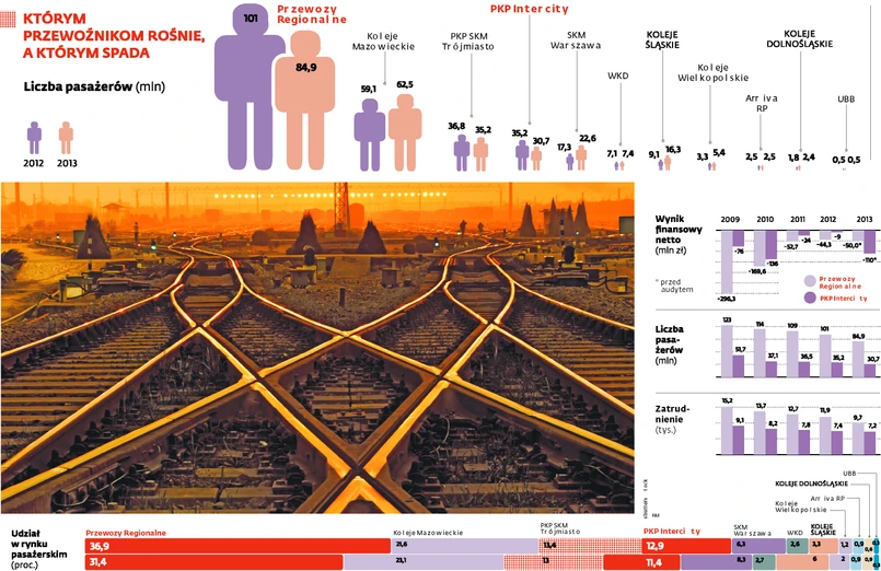Największa przewoźnik w Polsce – Przewozy Regionalne – od lat przynosi straty i z każdym rokiem traci pasażerów. W ubiegłym roku – według nieostatecznych informacji, bo jeszcze nie zakończył się audyt. – Przewozy przyniosły w 2013 r. 50 mln zł straty netto. Nowy prezes Tomasz Pasikowski, który został tu ściągnięty z sektora bankowego przez wicepremier Elżbietę Bieńkowską, szacuje stratę na 2014 r. na ok. 30 mln zł. Celem na 2015 r. ma być wyjście na zero lub uzyskanie niewielkiego zysku.