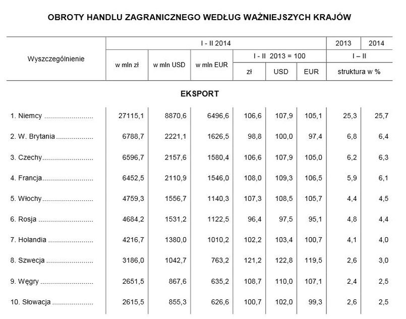 "W okresie styczeń – luty br. wśród głównych partnerów handlowych Polski odnotowano wzrost eksportu do Szwecji, na Węgry, do Francji, Włoch, Niemiec, Czech, Holandii oraz na Słowację, a importu – z Belgii, Chin, Niemiec, W. Brytanii, Francji oraz Rosji. Natomiast spadek eksportu odnotowano w obrotach z Rosją i W. Brytanią, a importu – ze Stanami Zjednoczonymi, z Czechami, Włochami oraz Holandią" - czytamy dalej.