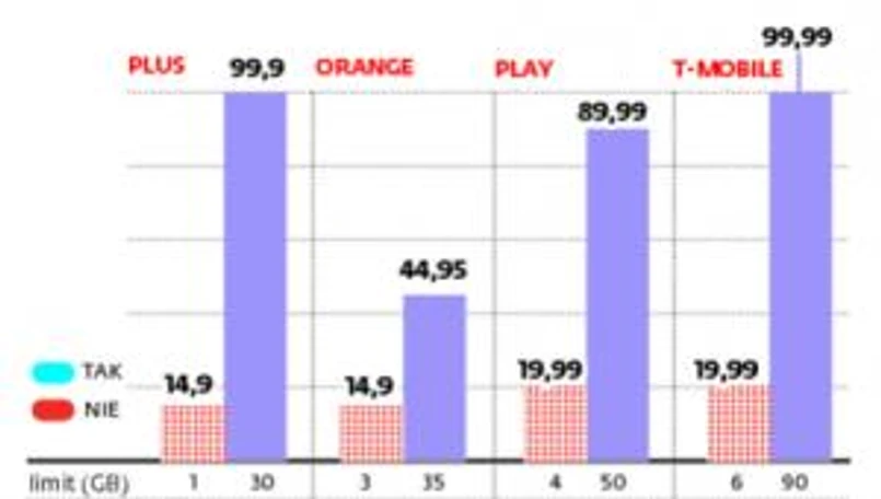 eśli jednak wziąć pod uwagę dodatkowe usługi przyznawane abonentom przez pozostałych operatorów oraz fakt, że T-Mobile jako jedyny nie uruchomił jeszcze LTE, to przewaga tego telekomu nie jest już tak jednoznaczna. W Orange abonament można obniżyć o 10 zł, jeśli jednocześnie korzysta się z dwóch usług. Ponadto przy miesięcznej opłacie 2,99 zł mamy możliwość aktywowania usługi polegającej na nielimitowanym transferze między północą a ósmą rano. Klienci tej sieci, przedłużając umowę, powiększą swój pakiet o kolejne 40 proc.