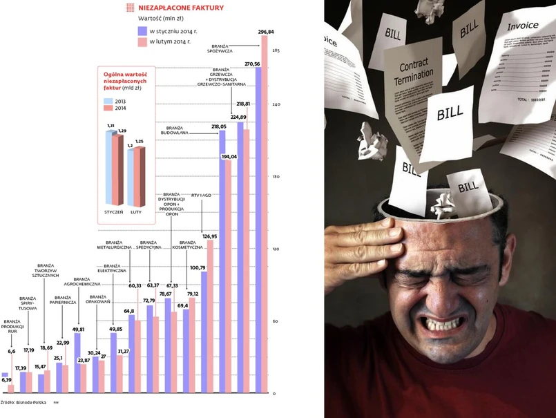 Dane za cały 2013 rok i pierwszy miesiąc tego roku były raczej optymistyczne: wielkość zatorów systematycznie malała, ubywało też dłużników. Dlatego informacje za luty (najświeższe, jakie Bisnode jest w stanie przeanalizować) to zaskoczenie. Nie dość, że liczba niezapłaconych rachunków na czas wyniosła prawie 27 tys. – czyli o 7 proc. więcej niż przed rokiem – to jeszcze wzrosła wielkość zadłużenia. I to prawie o 5 proc. W sumie kontrahenci klientów Bisnode zalegali im z płatnościami na ponad 1,25 mld zł.