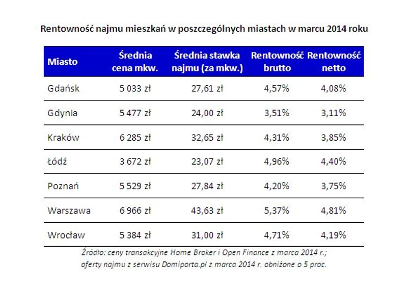 Z danych Domiporta.pl oraz Home Broker i Open Finance wynika, że w największych aglomeracjach w Polsce średnia rentowność najmu netto mieszkań plasuje się na poziomie 4,03 proc. Najwyższe wskaźniki marcu uzyskała Warszawa ze średnią na poziomie 4,81 proc., następnie Łódź i Wrocław. Najniższy wskaźnik rentowności (3,11 proc.) zanotowano w Gdyni. – W Warszawie, mimo największej podaży ofert najmu w Polsce (prawie 47 tys. ofert), uzyskać można najbardziej korzystny poziom rentowności w porównaniu z innymi miastami. Jest to związane z tym, że stawki najmu w przeliczeniu na metr również są najwyższe – wyjaśnia Maciej Górka z Domiporta.pl. W ostatnich miesiącach spadła rentowność najmu w Gdańsku, gdzie jesienią wskaźnik ten wynosił 4,5 proc., a teraz 4,1 proc.