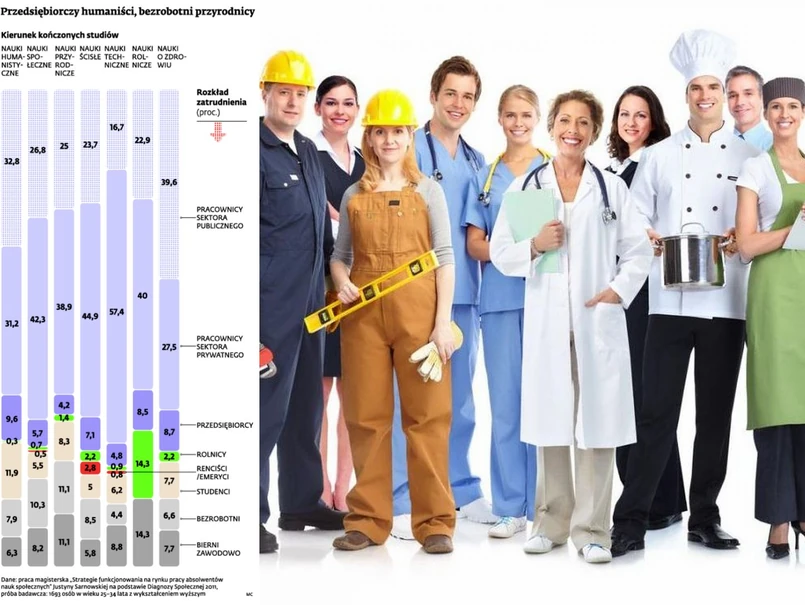 Najmniej osób prowadzących własną działalność gospodarczą jest wśród absolwentów nauk przyrodniczych (4,2 proc.). Jest to również grupa, która wyróżnia się największym odsetkiem bezrobotnych (11,1 proc.) oraz biernych zawodowo (również 11,1 proc.). – Tak naprawdę skończenie takich kierunków jak biologia czy chemia daje dosyć wąski wybór ścieżek kariery. Stąd też choć wydawać by się mogło, że to studia dające fach, wśród tych absolwentów jest największy odsetek niepracujących – wyjaśnia Sarnowska.