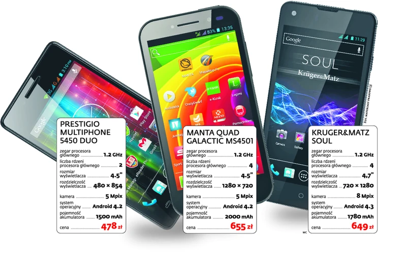 To z jednej strony efekt coraz lepszej jakości smartfonów B-brandów (tańszych marek), z drugiej taryf SIM only, czyli abonamentów bez telefonu, oferowanych przez operatorów po korzystnych cenach. Na przykład smartfon Kruger & Matz SOUL ma podobny rozmiar wyświetlacza i rozdzielczość jak Samsung Galaxy SIII. Oba urządzenia mają czterordzeniowy procesor i ten sam system operacyjny. Ale za S3 trzeba zapłacić niemal dwa razy tyle. Z kolei Manta chwali się, że produkowany przez nią model Quad Galactic dorównuje telefonom takim jak Samsung Galaxy Ace3 czy droższemu HTC Desire 500.