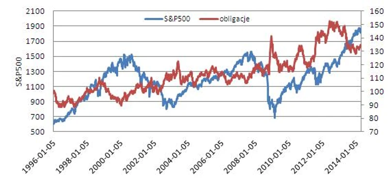 Obawy tych ostatnich zdaje się potwierdzać obserwacja zachowania się rynku obligacji oraz wcześniejszych relacji między cenami papierów dłużnych i indeksami giełdowymi. Notowania obligacji zaczęły wchodzić w fazę ostrego spadku w połowie 2012 r., a od listopada nikt już nie miał nie miał co do tego wątpliwości. Do końca 2013 r. notowania amerykańskich 30-letnich obligacji poszły w dół o prawie 17 proc., a ich rentowność wzrosła z 2,45 do niemal 4 proc., czyli o prawie dwie trzecie. Można więc powiedzieć, że bez wątpienia mieliśmy wówczas do czynienia ucieczką kapitałów z rynku obligacji na giełdę, zwaną „wielką rotacją”. Ograniczanie skupu papierów przez Fed i perspektywa zaostrzenia polityki pieniężnej powinny ten proces co najmniej podtrzymywać. Tymczasem od początku 2014 r. ceny obligacji zaczęły dynamicznie iść w górę, a rentowność wróciła do poziomu 3,4-3,5 proc. Symptomatyczne jest, że tendencja ta idealnie zbiegła się w czasie z rozpoczęciem ograniczania skupu obligacji przez Fed.