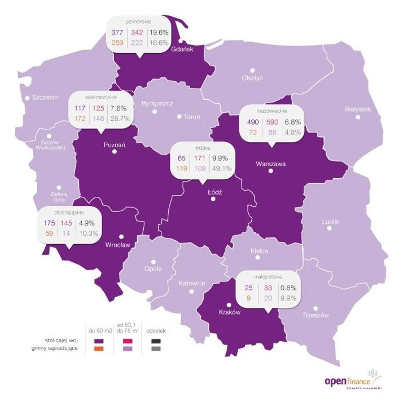 Dane BGK pokazują, że zdecydowana większość dopłat nadal trafia do stolic województw. Po jednej trzeciej roku rekord należy do świętokrzyskiego, gdzie 91 proc. wniosków całego województwa pochodzi z Kielc, drugie w kolejności jest lubuskie - 75 proc. wzięły Zielona Góra i Gorzów Wielkopolski. Dalej jest łódzkie. Na Łódź przypadło 71 proc. wniosków kredytowych, które wyszły z województwa. Lublin wziął 69 proc. w lubelskim. Z kolei w kujawsko-pomorskim pierwsze skrzypce odgrywają Bydgoszcz i Toruń, stamtąd wyszło 68 proc. wniosków całego województwa. Mocno nad resztą województwa góruje też Kraków, z którego wyszło 65 proc. wniosków Małopolski. Wysoki udział stolic w akcji kredytowej zazwyczaj pokazuje, że zazwyczaj słabo radzą sobie gminy województwa i reszta województwa.
