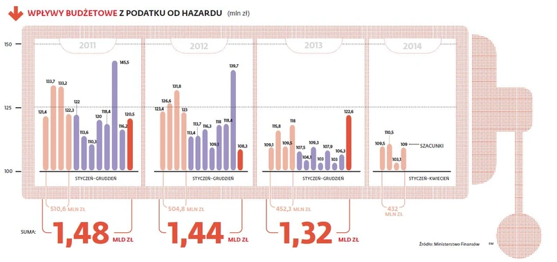 Mimo to, według MF, wykonanie dochodów z podatku od gier w porównaniu z planami na cały rok wcale nie jest takie złe: w I kwartale wpływy wynosiły prawie 26 proc. z zaplanowanych na 2014 r. 1,25 mld zł.