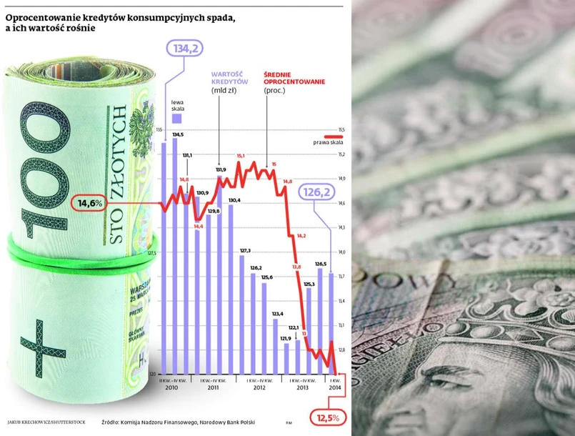 banki chcą zwiększać swój udział w rynku kredytów gotówkowych, bo jest im trudno zwiększać akcję kredytową w segmencie kredytów mieszkaniowych. W rozruszaniu rynku hipotek nie pomagają rekomendacje nadzoru finansowego, które nałożyły na starających się o takie pożyczki obowiązek posiadania wkładu własnego. Bankowcy mają też inny problem – długość depozytów nie jest dopasowana do okresu spłaty długoterminowych kredytów, na co nadzór również patrzy nieprzychylnym okiem. Wreszcie pożyczki konsumpcyjne, mimo ostatnich obniżek oprocentowania, wciąż pozwalają bankom zarabiać dużo więcej niż hipoteki. – A koszt ryzyka związanego z ich udzielaniem spada. Zauważalne są wyraźna poprawa na rynku pracy oraz wzrost wynagrodzeń, co przekłada się na mniejszy udział kredytów zagrożonych w portfelu banków – uważa Kamil Stolarski, analityk sektora finansowego w Espirito Santo Investment Bank.