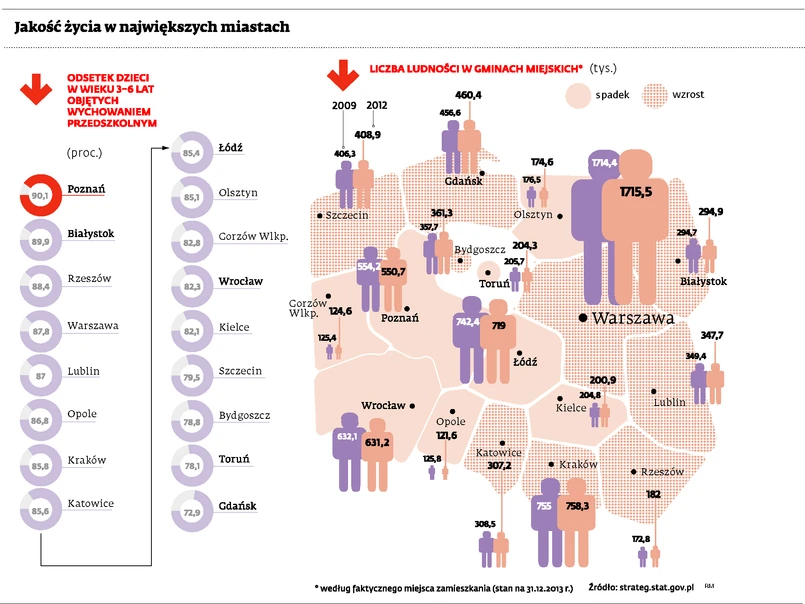 Jak jest naprawdę? Sprawdziliśmy to na wybranych wskaźnikach świadczących o jakości życia w danym mieście, m.in. zmieniającej się liczbie faktycznych mieszkańców, dostępie do przedszkoli i internetu czy wydatkach miasta na kulturę (na podstawie danych z rządowego systemu STRATEG).