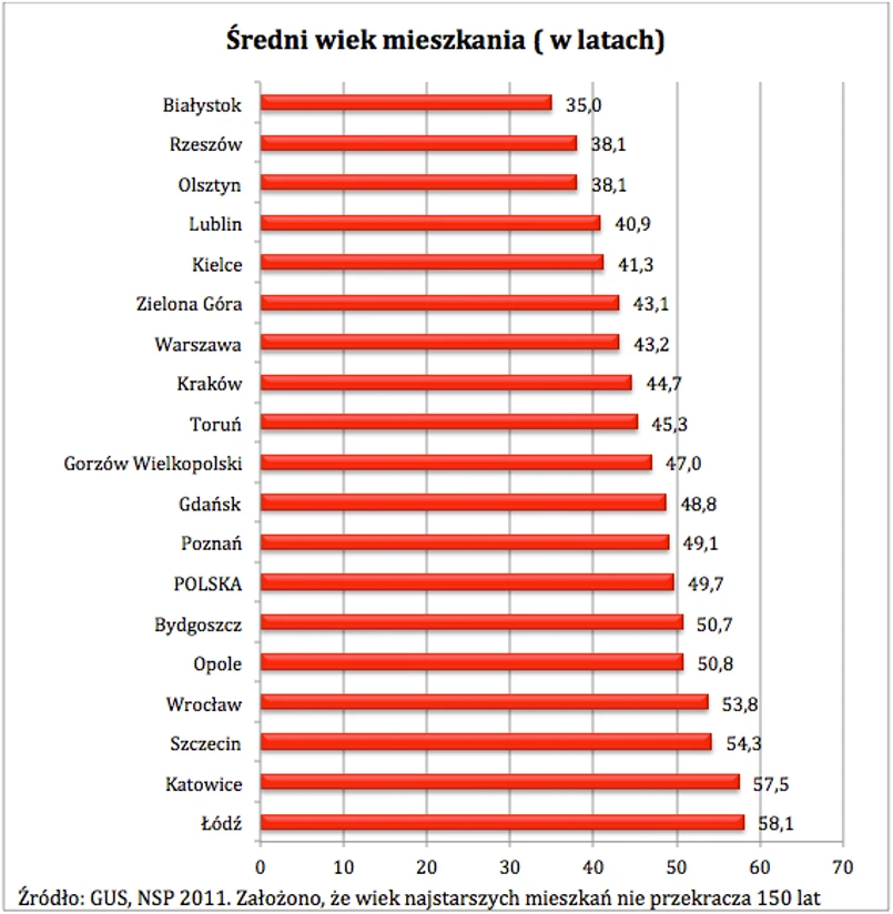 Na podstawie danych z Narodowego Spisu Powszechnego przeprowadzonego w 2011 r. (GUS) Lion's Bank oszacował, że w gronie miast wojewódzkich najmłodszymi mieszkaniami mogą się pochwalić Białystok (35 lat), Rzeszów (38,1) i Olsztyn (38,1). Z drugiej strony najstarsze mieszkania znaleźć można w Katowicach (57,5) i Łodzi (58,1).