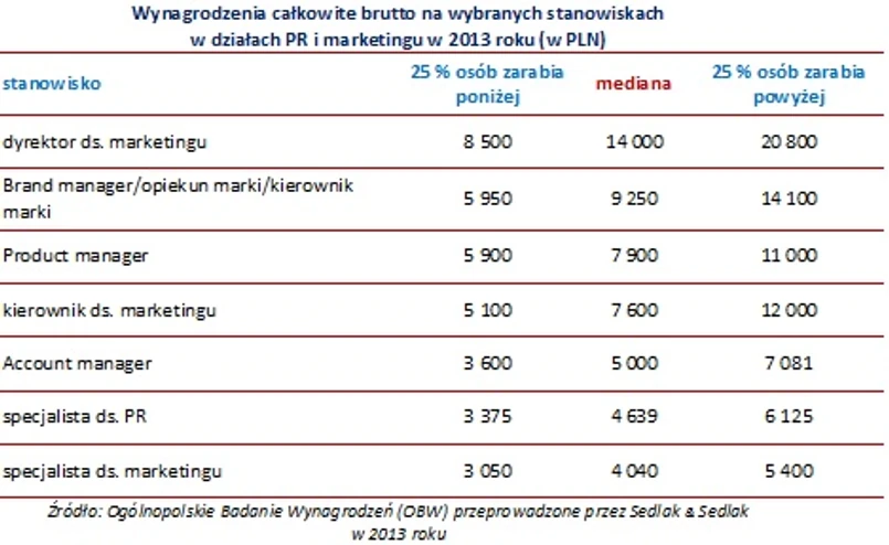 Najlepiej zarabiającą z analizowanych grup pracowników byli dyrektorzy ds. marketingu. Najwyższe zarobki w tej grupie wyniosły 20800 zł. Mediana wynagrodzeń dla kierowników ds. marketingu wyniosła 7 600 zł. Połowa specjalistów ds. PR zarabiała powyżej 4 639 zł, z kolei specjalistów ds. marketingu powyżej 4 040 zł.