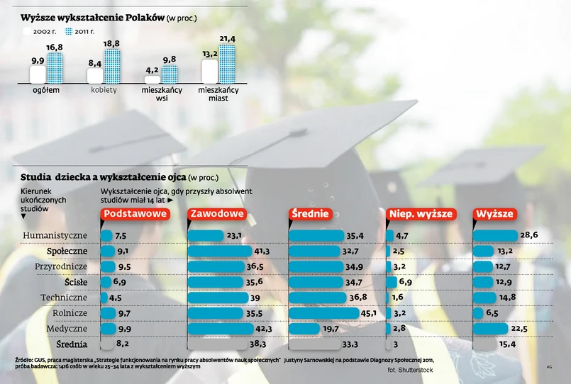 Sarnowska szczegółowo przeanalizowała dane dotyczące wpływu wykształcenia ojca na sytuację absolwentów wyższych uczelni. Najwyraźniej widać go w przypadku kierunków humanistycznych. Prawie 29 proc. ojców osób po kierunkach humanistycznych miało dyplom uczelni wyższej, w momencie gdy ich dzieci miały 14 lat. To niemal dwa razy więcej niż średnio wśród wszystkich absolwentów studiów wyższych. Za to wśród absolwentów nauk społecznych aż 41 proc. ma ojców z wykształceniem zawodowym i zaledwie 13 proc. z wyższym. Absolwenci studiów rolniczych też masowo wywodzą się z rodzin o znacznie słabszym wykształceniu niż przeciętnie. A to właśnie wśród tych absolwentów jest najwięcej osób mających problemy ze znalezieniem pracy zgodnej z wykształceniem.