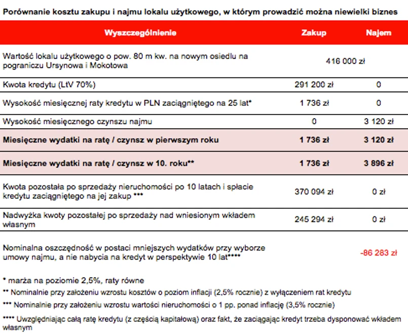 Znalezienie odpowiedniego dla danego biznesu lokalu jest więc wyzwaniem. Spełnienie wszystkich wymagań prawnych i technicznych nie zamyka ponadto pytania – czy lepiej taki lokal kupić, czy raczej optymalnym rozwiązaniem byłby jego wynajem? Odpowiedzi na to pytanie nie sposób sprowadzić do prostej kalkulacji kosztów. Należy bowiem pamiętać, że każda firma ma inne potrzeby i możliwości, a jednocześnie nie każda posiada kapitał niezbędny, aby kupić nieruchomość. Nie każda ma także zdolność kredytową, aby na taką inwestycję pozyskać środki z banku. Rozważmy jednak konkretny przykład przedsiębiorcy poszukującego nieruchomości, w której chciałby prowadzić niewielki osiedlowy sklepik, salon fryzjerski czy kameralną kawiarnię. Na potrzeby tej analizy przyjmijmy, że przedsiębiorca zastanawia się nad dwoma rozwiązaniami: najmem lub zakupem lokalu w nowej inwestycji, w której docelowo ma zamieszkać 6 tys. osób, na pograniczu Mokotowa i Ursynowa. Lokal ze sporą witryną ma powierzchnię 52 m kw., a jego cena to 416 tys. zł (netto). Przedsiębiorca zastanawia się które rozwiązanie będzie dla niego optymalne - zakup nieruchomości na 25-letni kredyt (30-proc. wkład własny) lub jego wynajem (stawka 60 zł za m kw.).