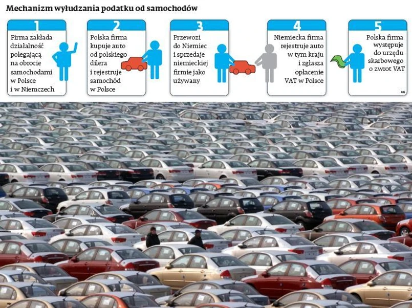 Z naszych informacji wynika, że chodzi o tzw. reeksport samochodów. Do tej pory o tym zjawisku mówiło się w kontekście legalnego wykorzystywania przez pośredników wahań kursu złotego wobec euro oraz rabatów od sprzedawców, które są z reguły wyższe w Polsce niż np. w Niemczech. Okazuje się, że profity pośredników są często znacznie wyższe, ale nielegalne. Zarejestrowane w Polsce firmy występuje bowiem do urzędu skarbowego o zwrot VAT, choć w Niemczech inna spółka deklaruje opłacenie tego podatku w Polsce. W ten sposób korzyść z obrotu samochodem zwiększa się o dodatkowe 23 proc. wartości auta. A to spora kwota zważywszy na fakt, że średnia cena aut sprzedawanych w Polsce sięga 90 tys. zł.