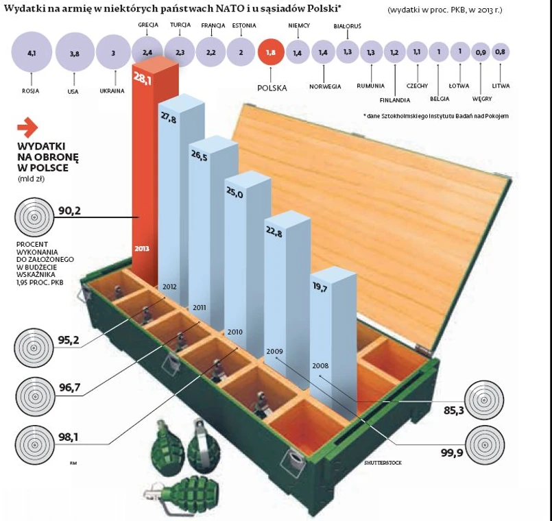 Dodatkowa kwota deklarowana przez prezydenta i premiera, czyli 0,05 proc. PKB, to dziś około 800 mln zł. –To około 10 proc. obecnych wydatków na modernizację techniczną sił zbrojnych – wyjaśnia Andrzej Kiński, redaktor naczelny miesięcznika „Nowa Technika Wojskowa”. Choć budżet MON to ponad 32 mld zł, ta suma to także wydatki na pobory żołnierzy, bieżące utrzymanie armii, koszty zagranicznych misji czy emerytury dla byłych wojskowych.