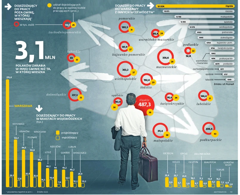 Z badań wynika, że spośród wszystkich pracowników najemnych dojeżdżających do pracy w Polsce poza własną gminę najwięcej mieszkało ich w 2011 r. w woj. śląskim – 15,6 proc. (487,3 tys.). Przede wszystkim ze względu na nagromadzenie dużej liczby miast na stosunkowo małym terenie.